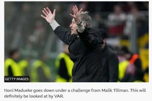 在BBC的直播间中,对这个点球的判罚描述为:马杜埃凯在与蒂尔曼的对抗中倒地,这肯定会由视频裁判进行审查。英格兰边锋几乎没受到任何接触,但判罚维持不变。